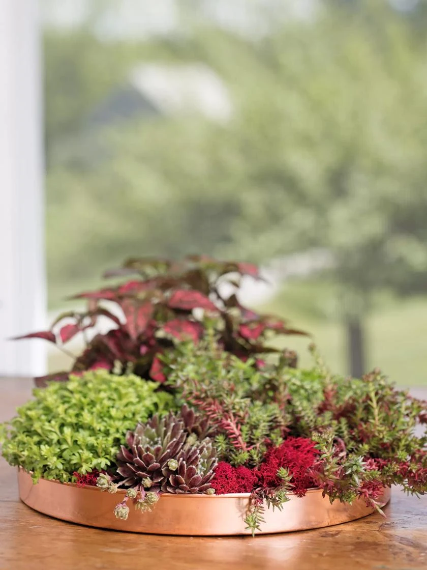 • Handsome copper tray dresses up potted plants and protects surfaces